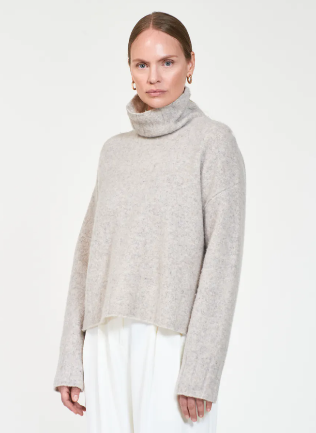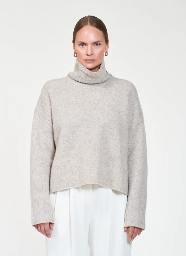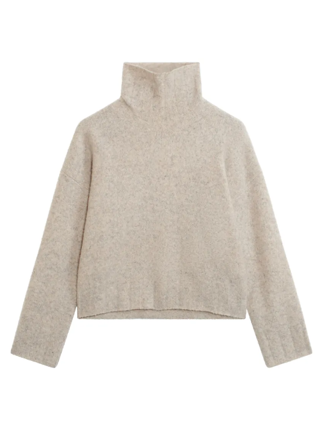 Fin genser med høyhals i en delikat lys beigemelert farge, strikket i en myk og stretchy ullblanding. Genseren har en løstsittende passform med delikate ribbestrikkede detaljer rundt mansjett og hem. Normal i størrelsen. Lys beigemelert.