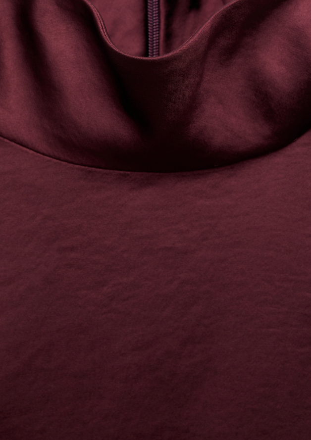 Ermeløs satengbluse med høy hals. Glidelås bak i nakken.