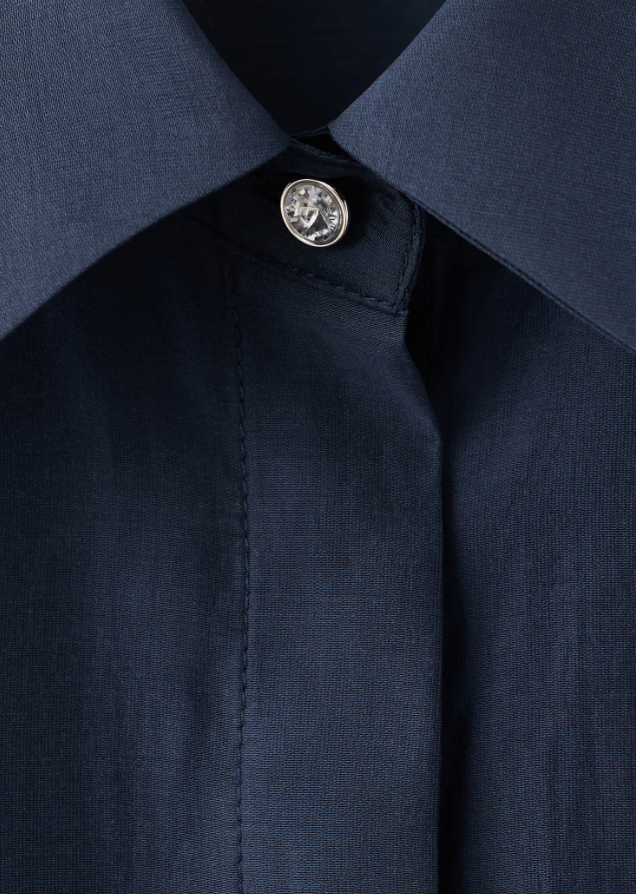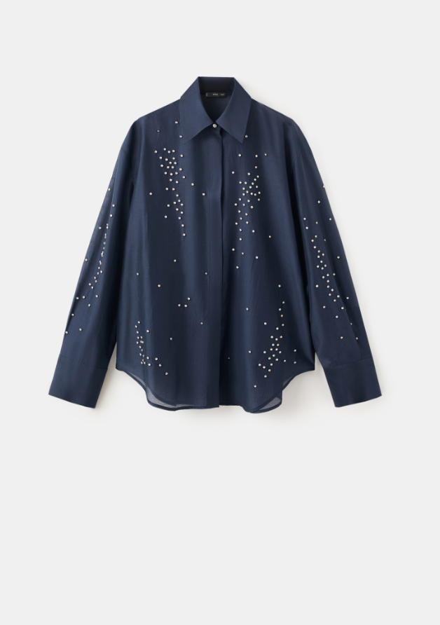 Lekker skjorte i lyocell med strassdetaljer. Skjorten har krage, lange ermer med knapper i mansjettene og skjult knappestolpe foran.