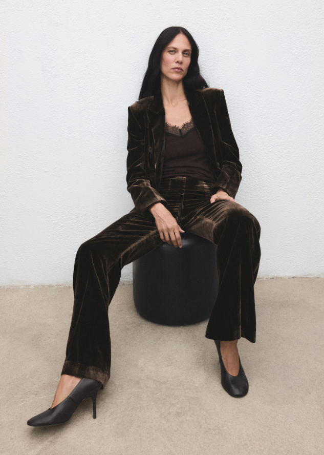 Lang dressbukse med utsvingete ben i speilfløyel .