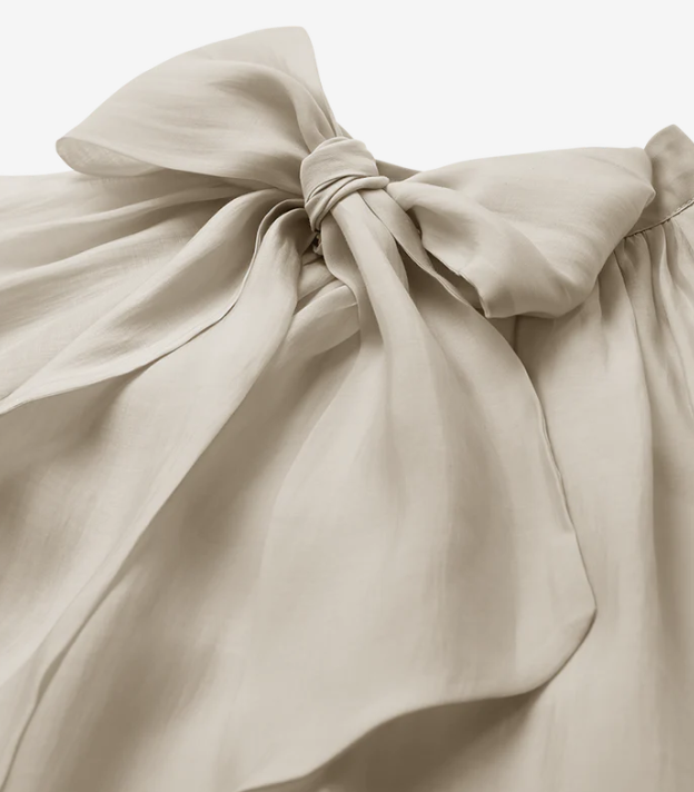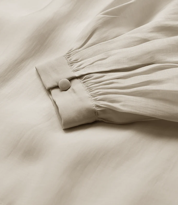 CMTILLY-BLOUSE er en bluse i en ekslusiv kvalitet med høy hals og en avtagbar sløyfe. Den har stoffknapper i nakken samt lange raglanermer med voluminøs ballongeffekt.