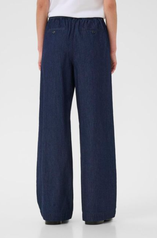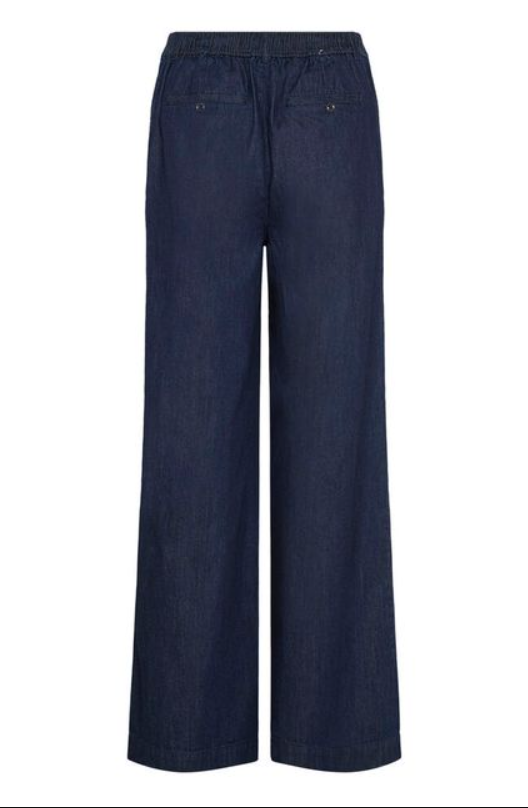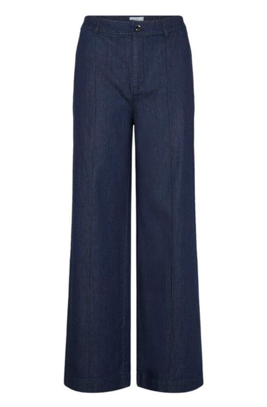 Stilig jeans med vide ben. Buksen har høy midje, beltehemper i linningen og lukkes med knapp og skjult glidelås foran.