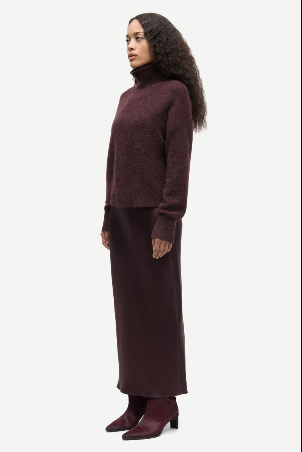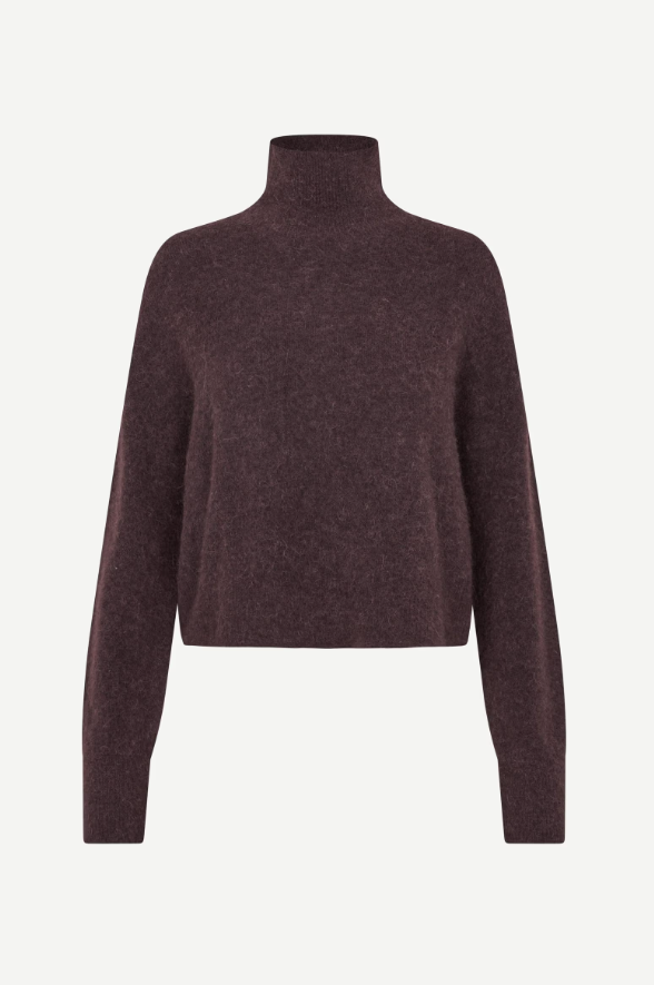 Turtleneck-genser med senkede skuldre og lange ermer. Ribbestrikket krage og ribbestrikker på mansjetter og fald nede.