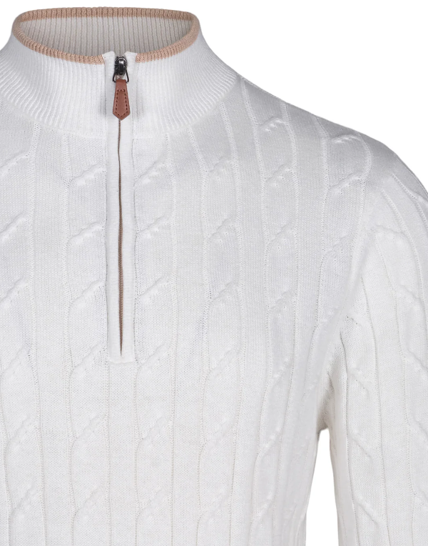 Favoritt Sivert Zip er tilbake! Utrolig delikat strikket mønster i stoffet. Genseren har halv-høy hals med glidelås. Tidløs og elegant genser som passer fint alene eller over sesongens skjorter. Kombineres gjerne med våre Tom-bukser. Laget i en behagelig bomull/cashmere kvalitet.