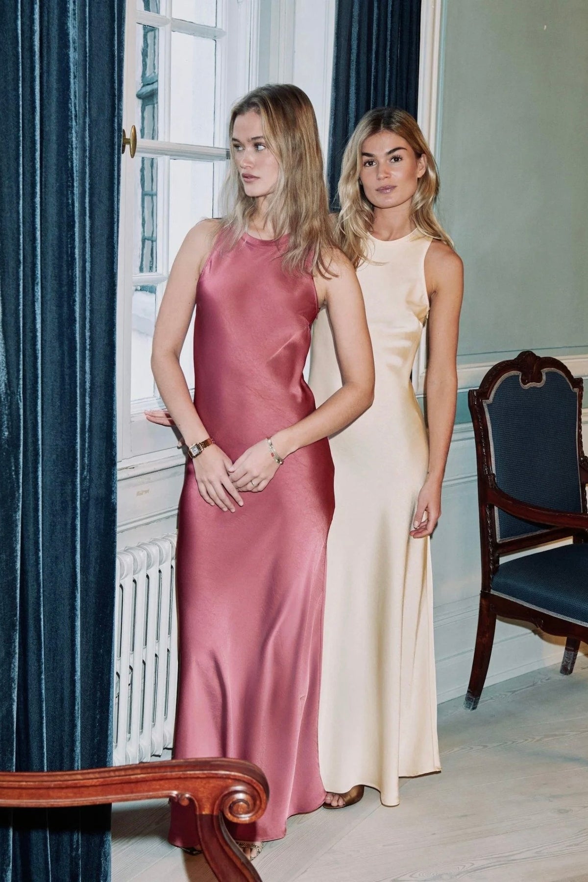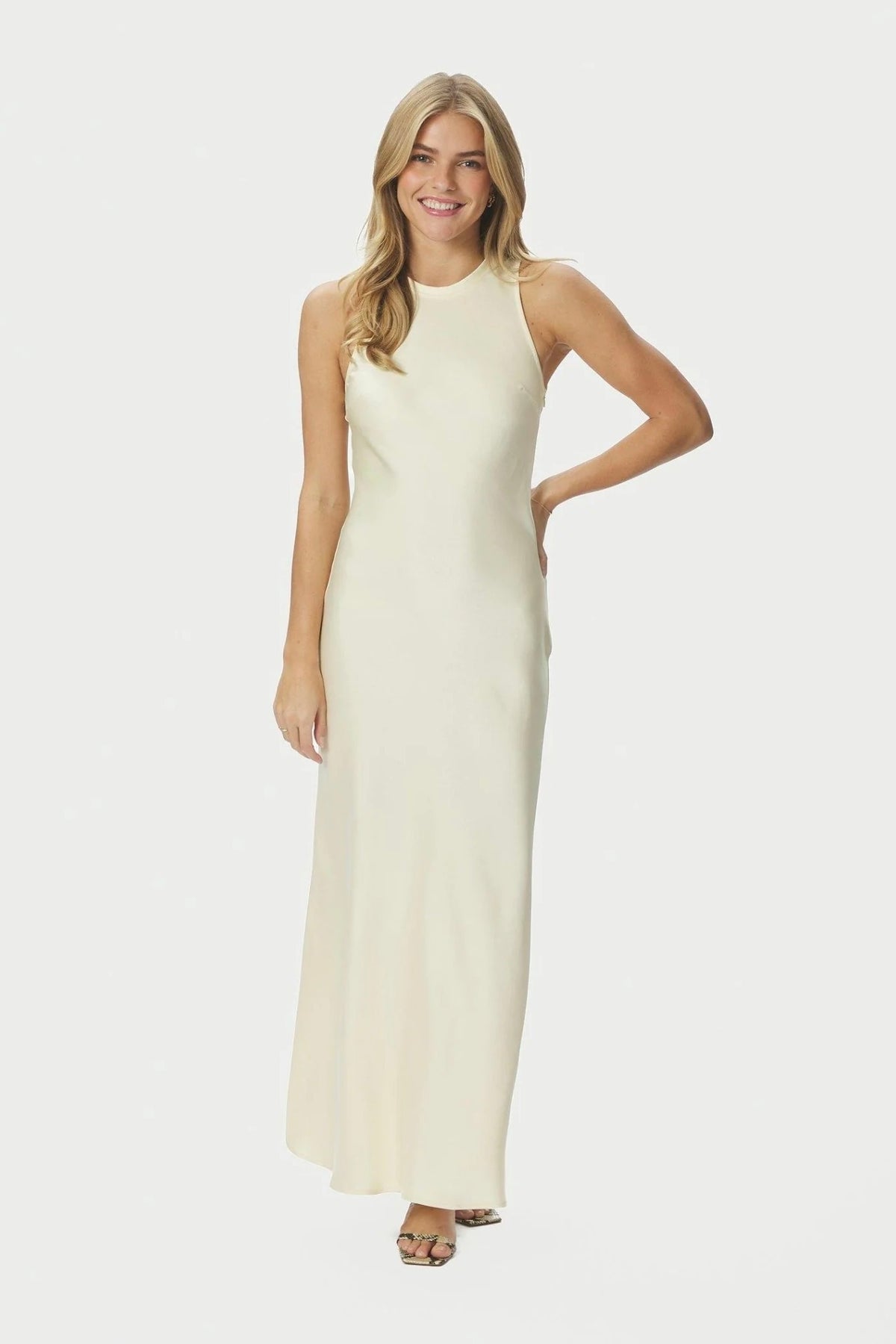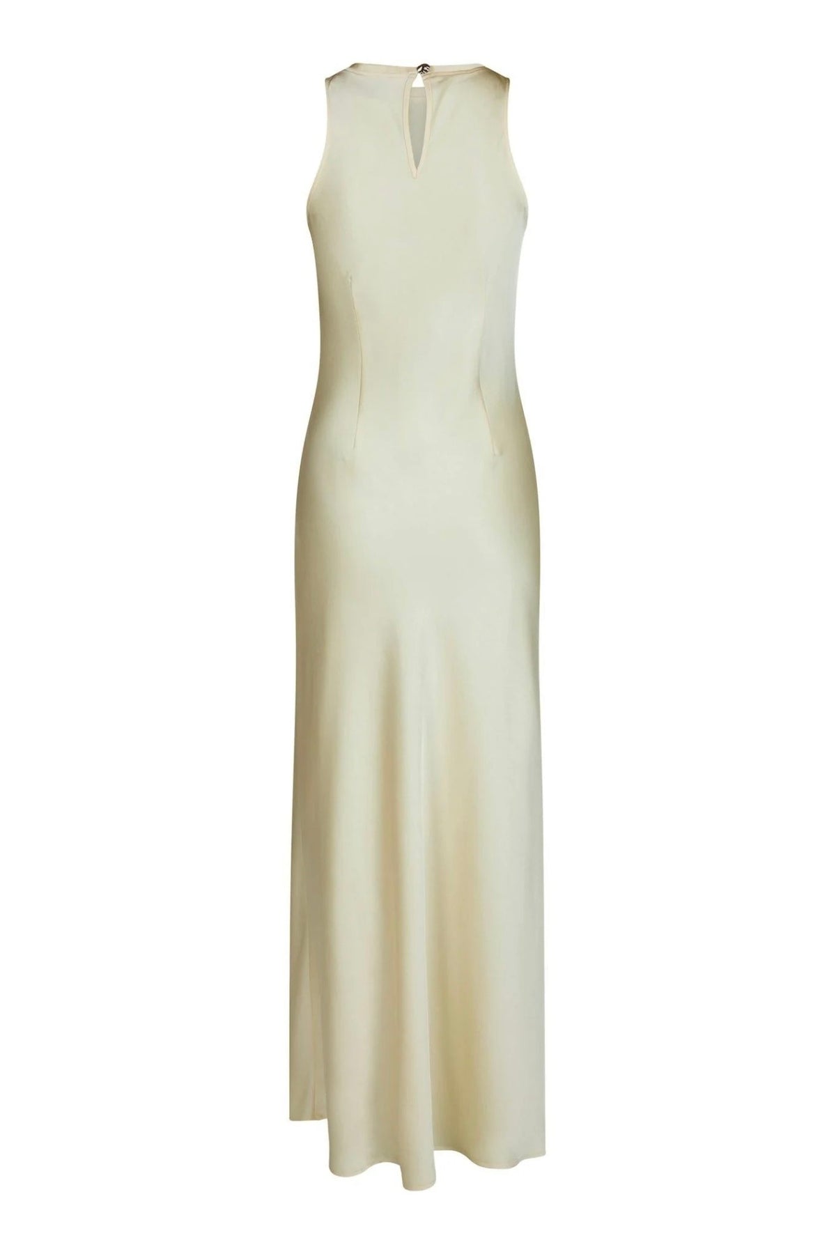 Celinie Heavy Sateen Dress fra Neo Noir: Elegant lang satengkjole i lys gul.