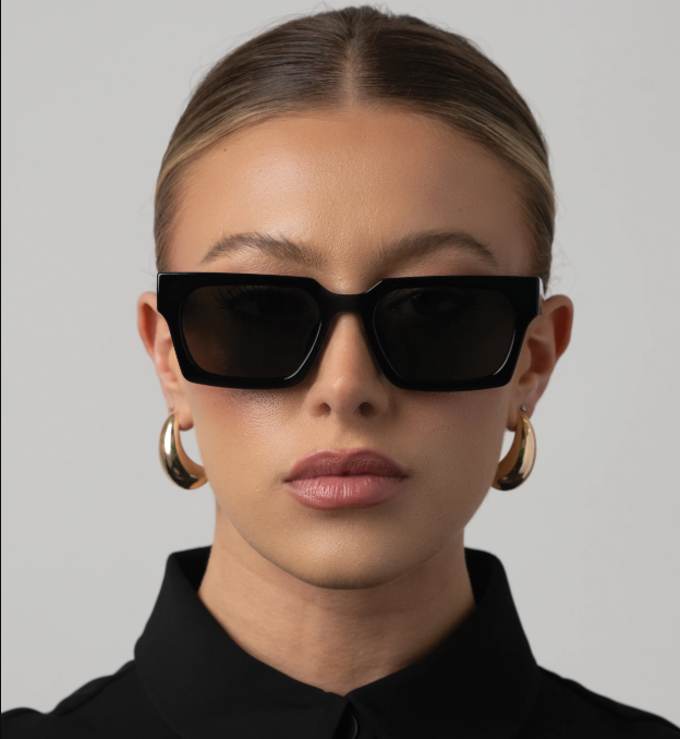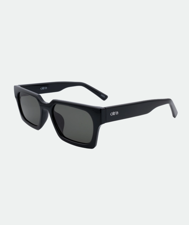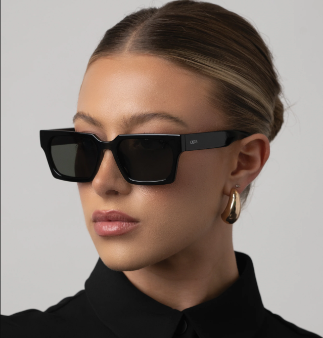 En firkantet innfatning i polert svart, kombinert med grønne glass for et subtilt moderne preg.