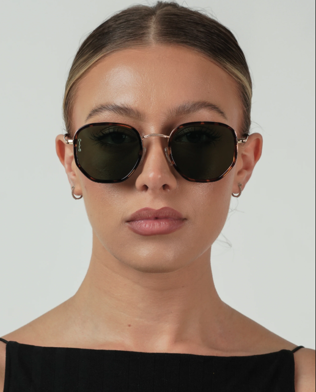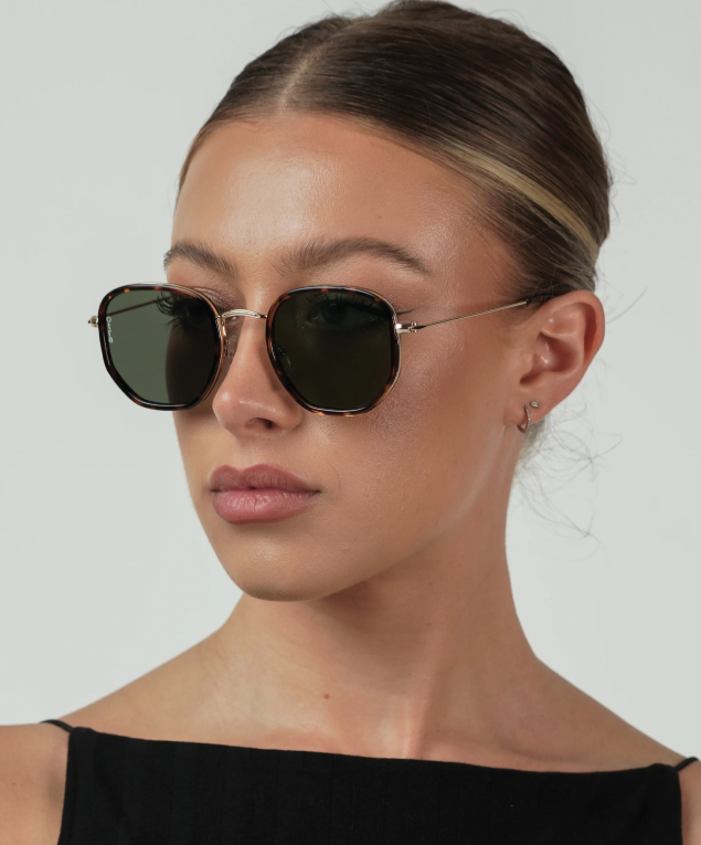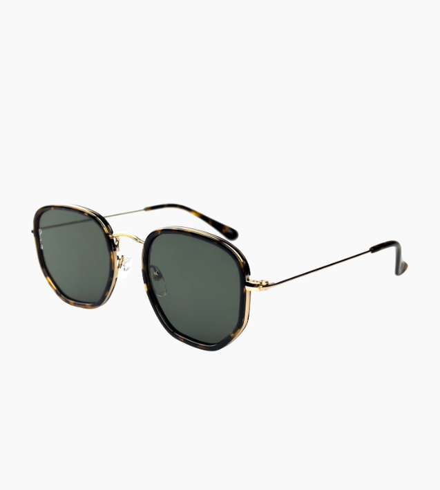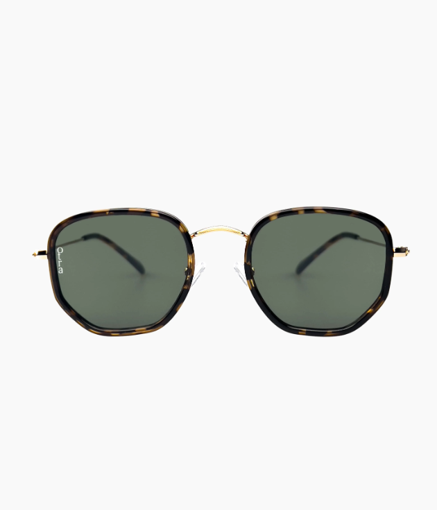 Sekskantede solbriller i metall med skilpaddeskallinnfatning, kombinert med grønne linser for en subtil, moderne kontrast.