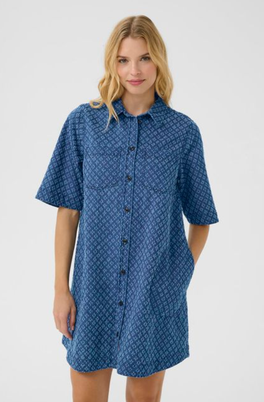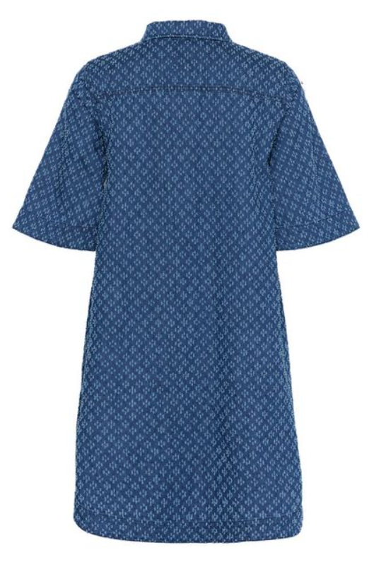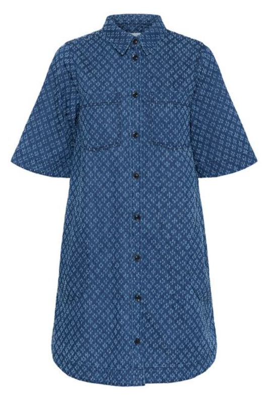 Denne skjortekjolen kombinerer klassisk denim med et moderne mønster i vevingen. Den har korte ermer, brystlommer og hel knappestolpe som gir en avslappet og samtidig strukturert look. Passformen er rett med lett innsving, perfekt alene eller lag-på-lag med bukser og boots.