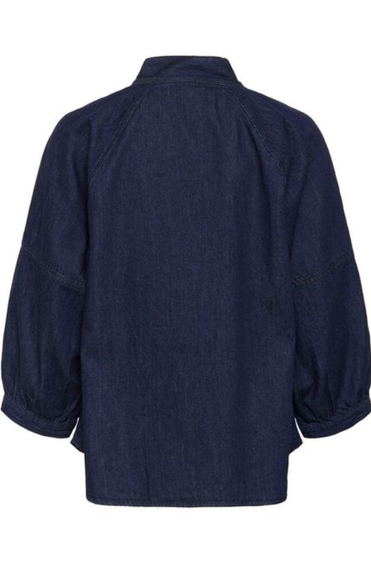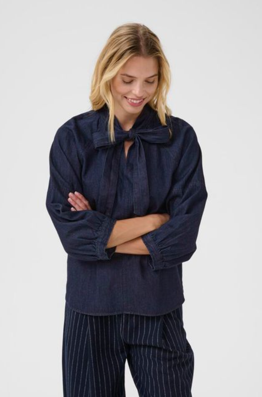 Denim skjorte som kombinerer kvalitet med en tidløs design. Med sin elegante mørkeblå farge og delikate sløyfe i halsen, vil denne skjorten garantert bli en favoritt i garderoben din.
