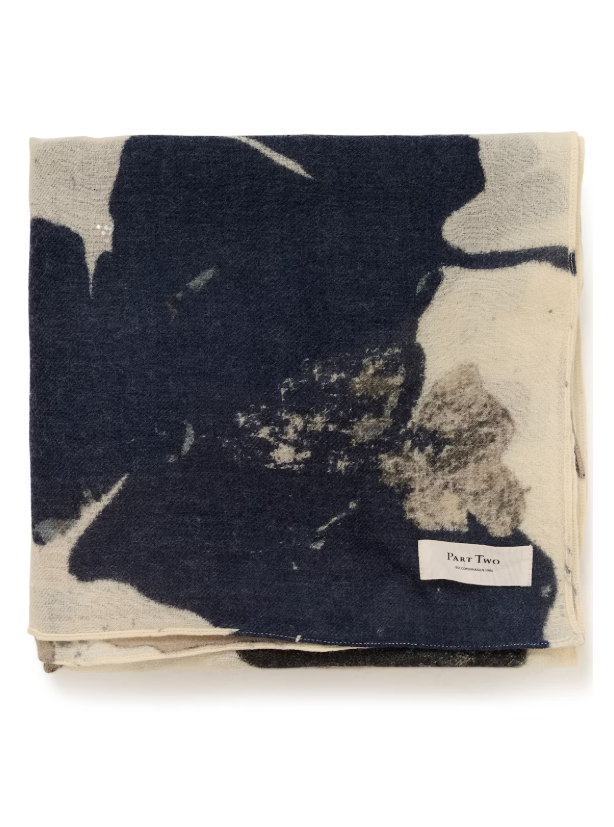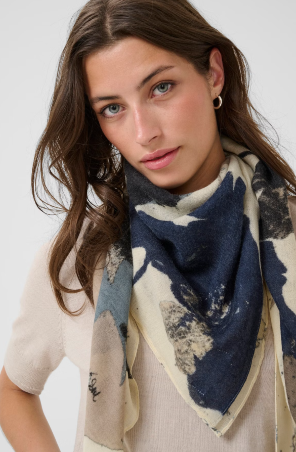 Dette lette og myke skjerfet har en råhvit bunn og et abstrakt blomstermønster i dempede nyanser av blått, brunt og beige. Det kvadratiske designet gjør det enkelt å style rundt halsen, i håret eller på vesken og tilfører et personlig preg til både hverdags- og reiseantrekk.