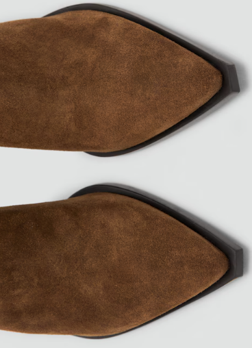 Tøffe ankelboots med spiss butt tå. Blokkhæl- Fremstilt i semsket skinn.