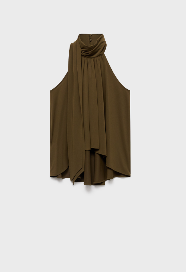 Halterneck-topp med sløyfe. Lukkes med knapper bak i nakken.