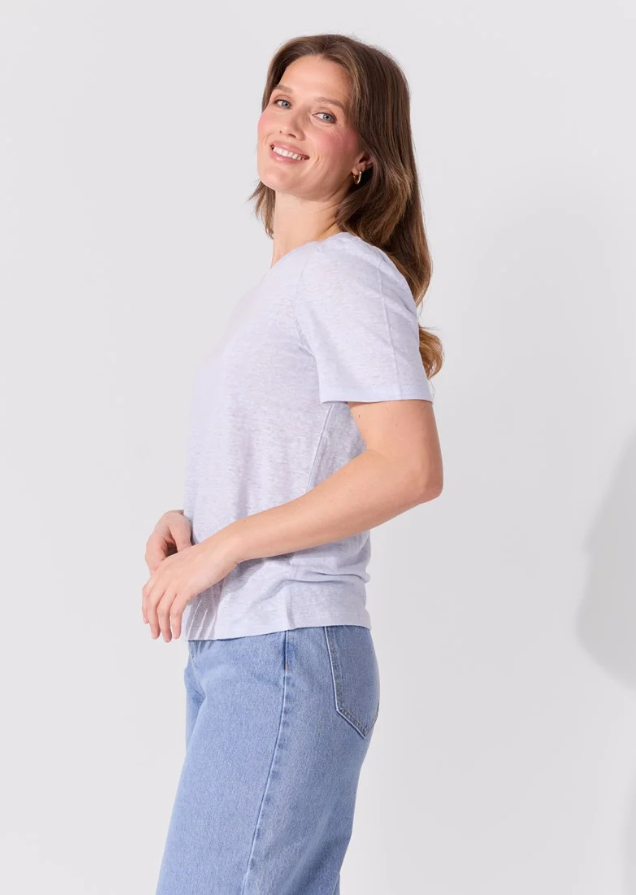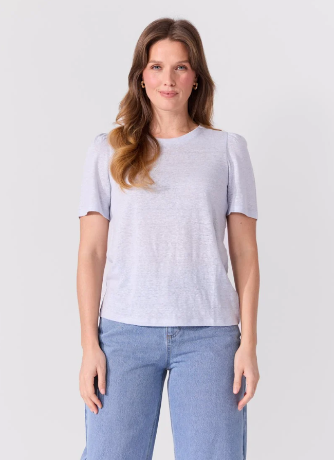Topp i behagelig linstoff. Den har korte ermer med litt puff og rund hals.