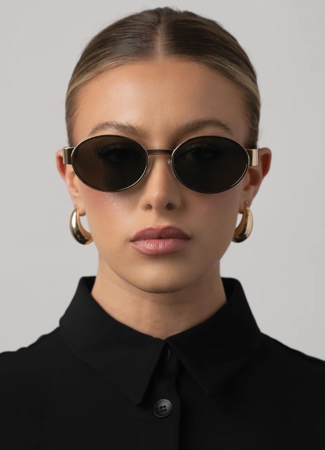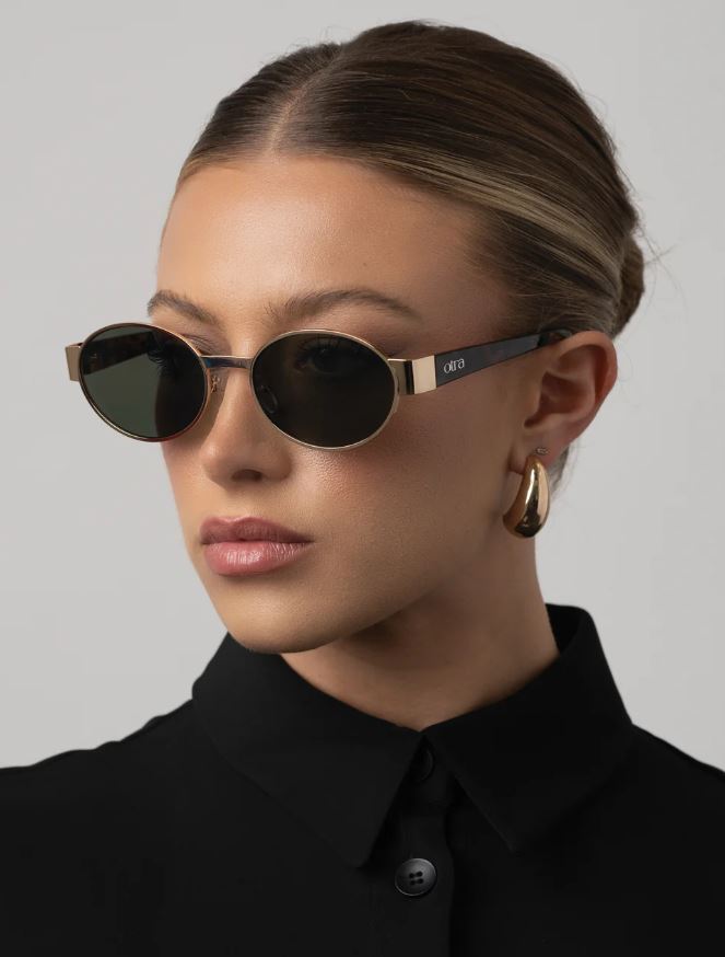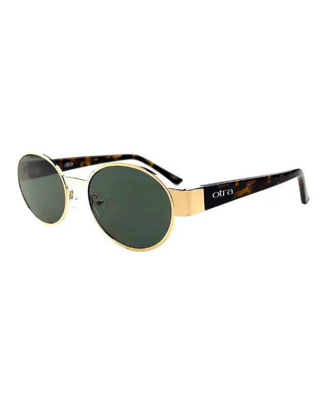 Echo fra Otra Eyewear er en superkul solbrille med ovale brilleglass. Den har gullfarget innfatning, sotede glass med svakt grønnskjær og brunmelert brillestang. Brilleglasset har 100% UV-beskyttelse. "Otra"-logo på siden og på glasset.