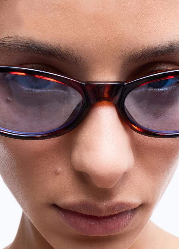 Ultra-elegante cat-eye-solbriller med en moderne vri. Designet med en tynn skilpaddeskall-ramme og slående blå linser, gir denne minimalistiske silhuetten akkurat passe kant.