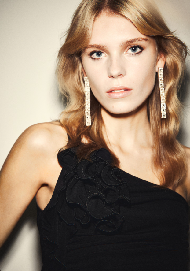 Tettsittende asymmetrisk topp med rynkedetaljer og rysjepynt ved den ene skulderen.