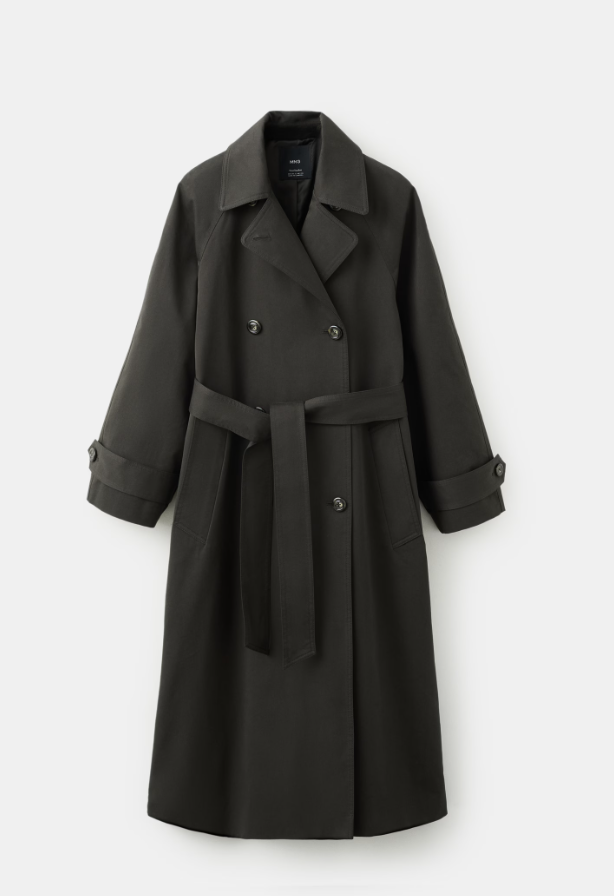 Lang dobbelspent trenchcoat med belte i livet. Bred krage med slag.