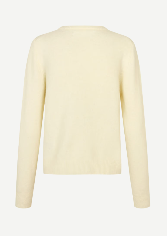 Langermet cardigan i en vanlig passform fullført med knappelukking midt foran. Ribbestrikket rund hals, mansjetter og fald.