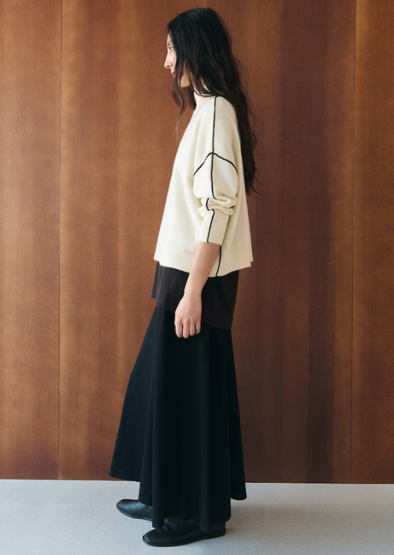 Genser i grovt strikket stoff. Genseren har et rett design og kontrastfargede striper og høy krage.