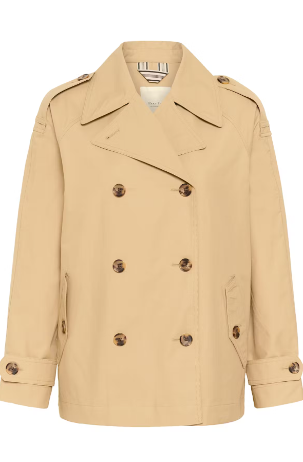 Denne korte trenchcoaten med dobbel knappelukking og markerte skuldre gir et klassisk og stilig uttrykk. Designet er avslappet, men strukturert – perfekt som lett yttertøy i overgangssesonger. Modellen er 180 cm høy og har på seg størrelse 36.