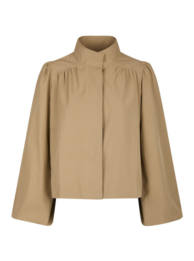 Kort jakke med høy hals. Jakken har frontlommer og en løs passform med vide ermer. Modellen er 176 cm og har på seg størrelse 36.